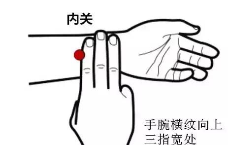内关穴位于掌侧腕横纹中点向手臂方向三横指处。